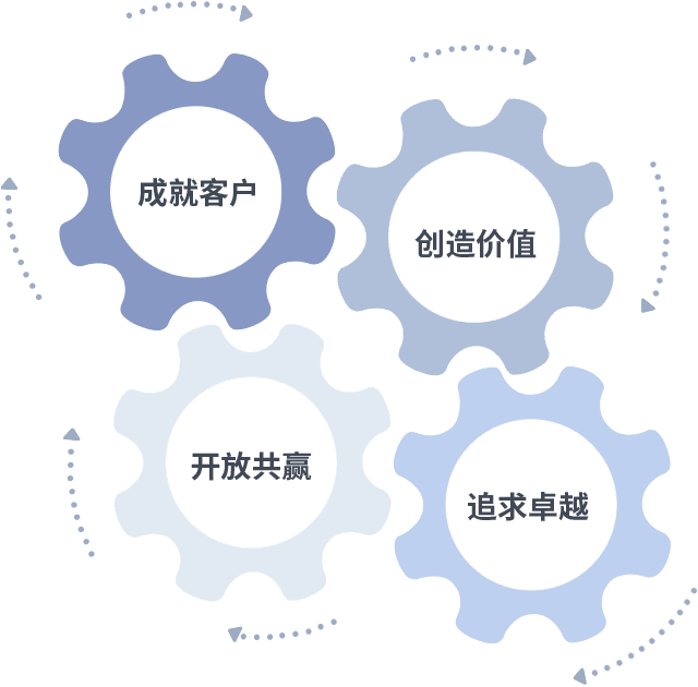 成就客户是一切决策的出发点,,,,创造价值是衡量所有工作的标准,,追求卓越是我们做事做人的态度,,,,开放共赢是我们的格局也是最终的结果。。价值观的齿轮环环相扣,,,,推动着组织里的每个人不断向前。。。。